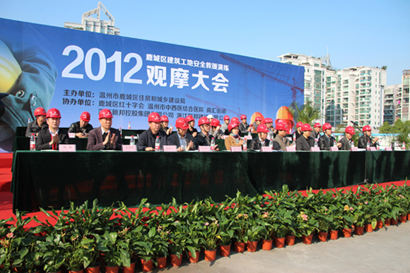 11月29日,由鹿城区住建局主办、公司集团协办,在横河西地块工地举行“人身触电伤害”事故应急救援预案现场演练,市住建委主任周守权、区人大副主任王长青、区政府副区长章月影、区政协副主席胡海峰、市建筑业处处长林云敏、区住建局局长朱国榜,区住建局副局长吴柏松、周海龙、徐建斌,区住建局纪委书记张品珠等局机关班子成员、区红十字会副会长杨静雯、南汇街道主任叶浪克、温州市中西医结合医院副院长姜阳贵、区安监局局长张海云、各街道(镇)建工委领导、区建设行业协会的领导出席了本次演练。鹿城区住建局副局长吴柏松担任本次演练总指挥。集团董事长陈锵对全体职工进行了动员和部署,强调了触电安全工作和演练的重要意义。