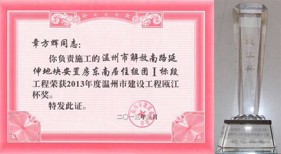 联合会经评选,授予公司2012年度“温州市建筑业优秀企业”荣誉称号、授予公司董事长陈锵2012年度“温州市建筑业优秀企业家”荣誉称号、授予公司项目经理黄成勇2012年度“温州市建筑业优秀项目经理”荣誉称号。公司承建的解放南路延伸地块、洞头国税局、藤桥镇第一小学教学综合楼等三项工程荣获2013年温州市建设工程瓯江杯(优质工程)。