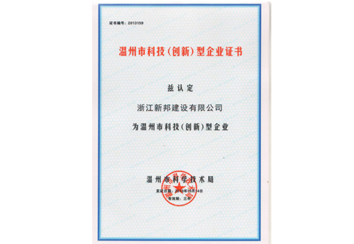 近日,我公司被温州市科技局认定为科技(创新)型企业,并授予荣誉证书,这对公司乃至全体员工均是一个极大的鼓励。这标志着新邦建设在科技(创新)领域取得了一定的成绩与地位。