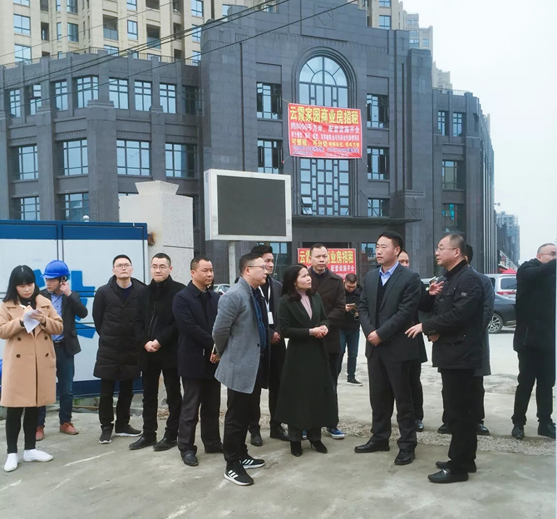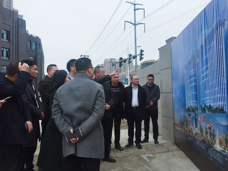 在工程项目施工现场,麻市长一行观看了侨贸广场项目平面规划图。在舒书记的详细介绍下,麻市长一行认真听取项目工程施工进度,并了解项目规划方案、质量安全管理等建设情况。