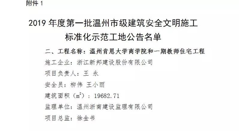 “温州肯恩大学商学院和一期教师住宅工程”被评为,温州市级建筑安全文明施工标准化示范工地;