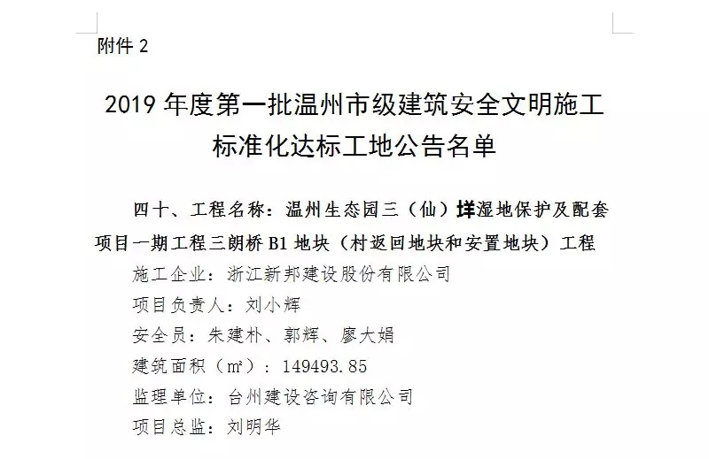 “温州生态园三(仙)垟湿地保护及配套项目一期工程三朗桥B1地块(村返回地块和安置地块)工程”被评为,安全文明施工标准化达标工地