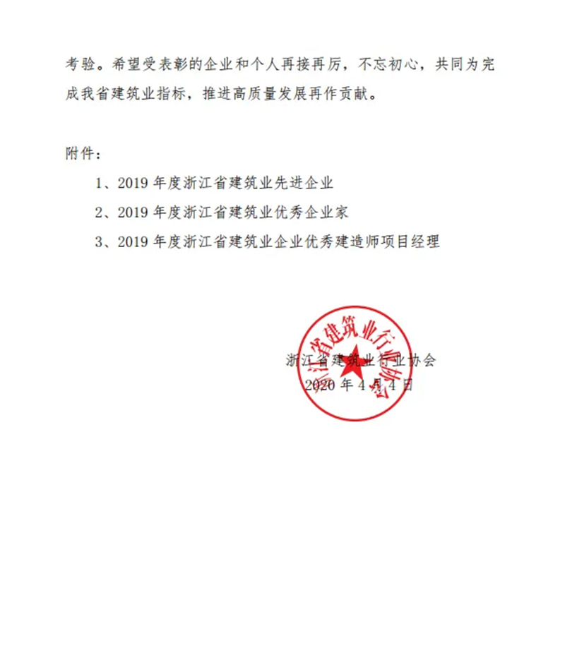 新邦建设获奖通知热烈祝贺新邦建设荣获“2019年度浙江省建筑业先进企业”称号,吴温艳同志获“2019 年度浙江省建筑业企业优秀建造师项目经理”称号。我们将不忘初心,再接再厉,在今后的工作中再创佳绩。