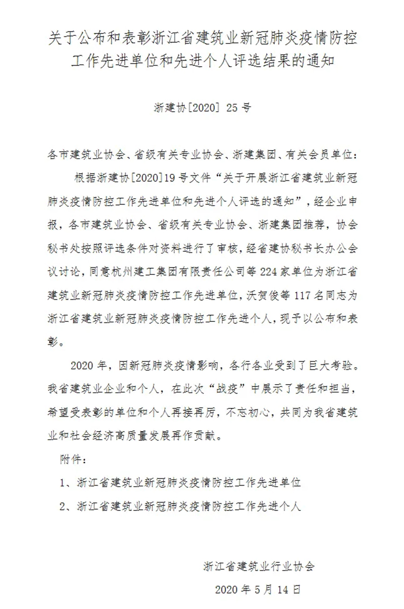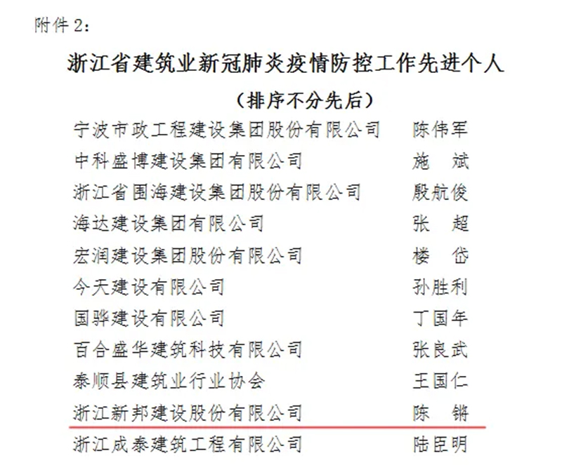 在经过各市建筑业协会、省级有关专业协会、浙建集团的层层推荐,以及浙江建筑业行业协会的审核后,新邦集团董事长陈锵荣获“浙江省建筑业新冠状肺炎疫情防控工作先进个人”称号,受到了上级部门的表彰。 2020年,因新冠肺炎疫情影响,各行各业受到了巨大考验。陈锵带领全体新邦人,在此次“战疫”中展现了自己的责任和担当,积极向抗疫一线捐款捐物,为取得“战疫”的胜利贡献了自己的力量。新邦集团将在陈锵董事长的带领下,再接再厉,不忘初心,为我省建筑业和社会经济高质量发展再作贡献。