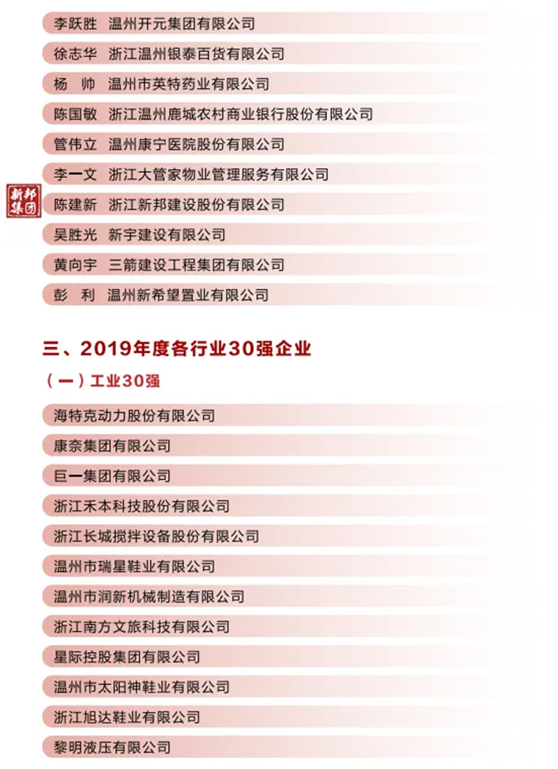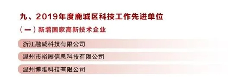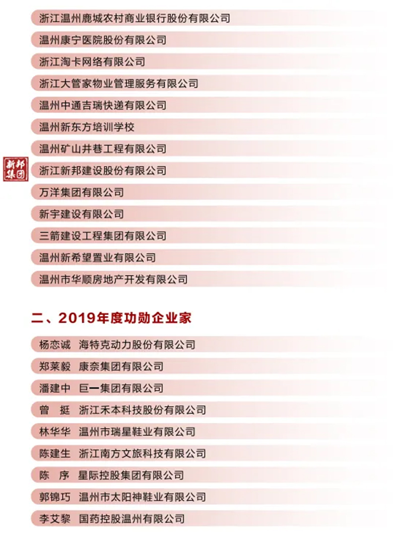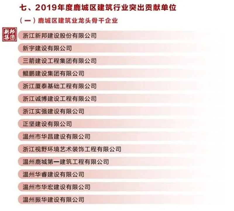浙江新邦建设股份有限公司 荣获2019年度鹿城区功勋企业、 鹿城区建筑业龙头骨干企业