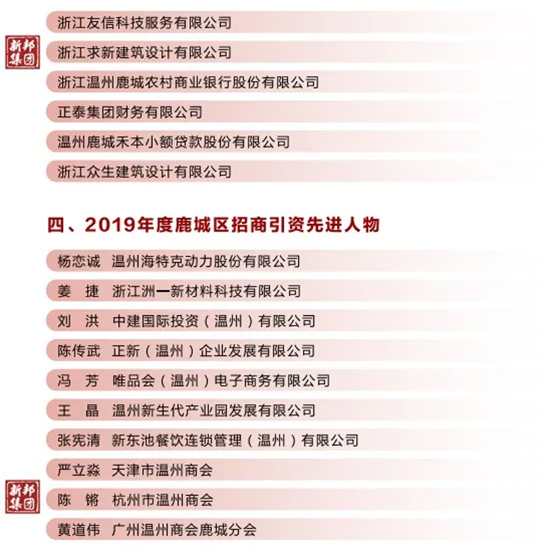 新邦集团董事长-陈锵 荣获2019年度鹿城区招商引资先进人物