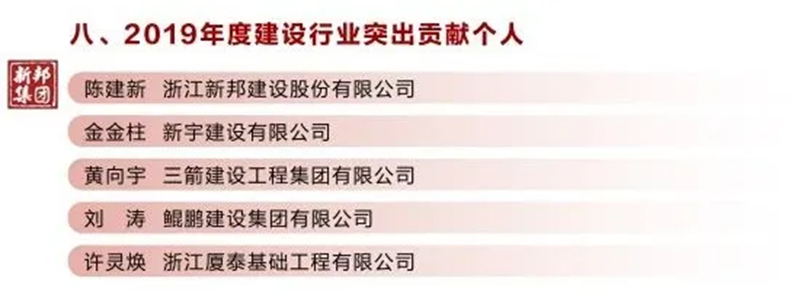 浙江新邦建设股份有限公司总经理-陈建新 荣获2019年度功勋企业家、 2019年度建设行业突出贡献个人