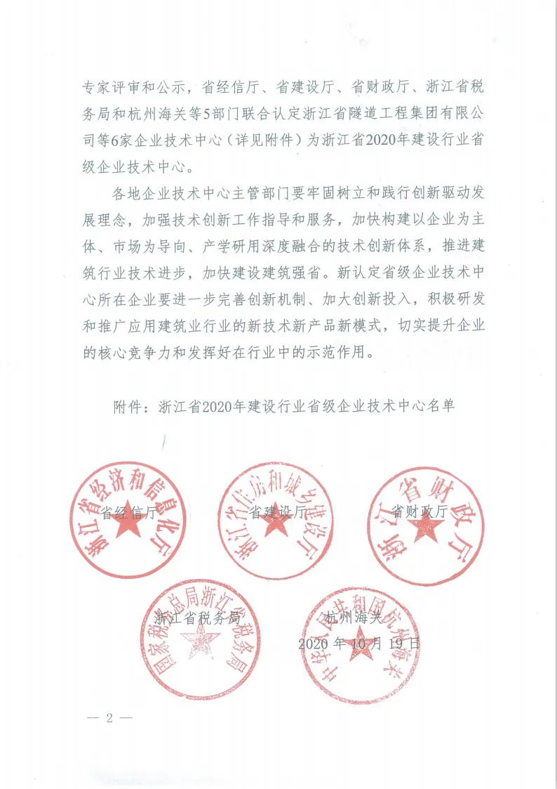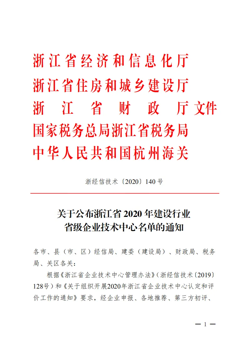 根据省厅文件通知,浙江新邦建设股份有限公司技术中心被省经信厅、省建设厅、省财政厅、省税务局、杭州海关等五部门联合认定为浙江省2020年建设行业省级企业技术中心。 新邦建设将以此为新的起点,结合企业发展需求,不断加大资源投入,持续完善规章制度,大力引进高水平人才,深入开展产学研合作,确保企业技术创新能力得到充足发展,不断取得新的成绩。