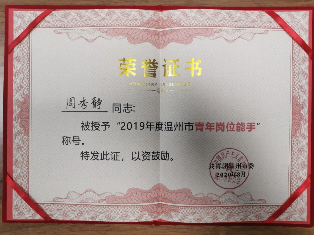 近日,新邦建设BIM事业部负责人周秀静荣获由共青团温州市委颁发的“2019年度温州市青年岗位能手”称号,收获又一份个人荣誉奖项。
