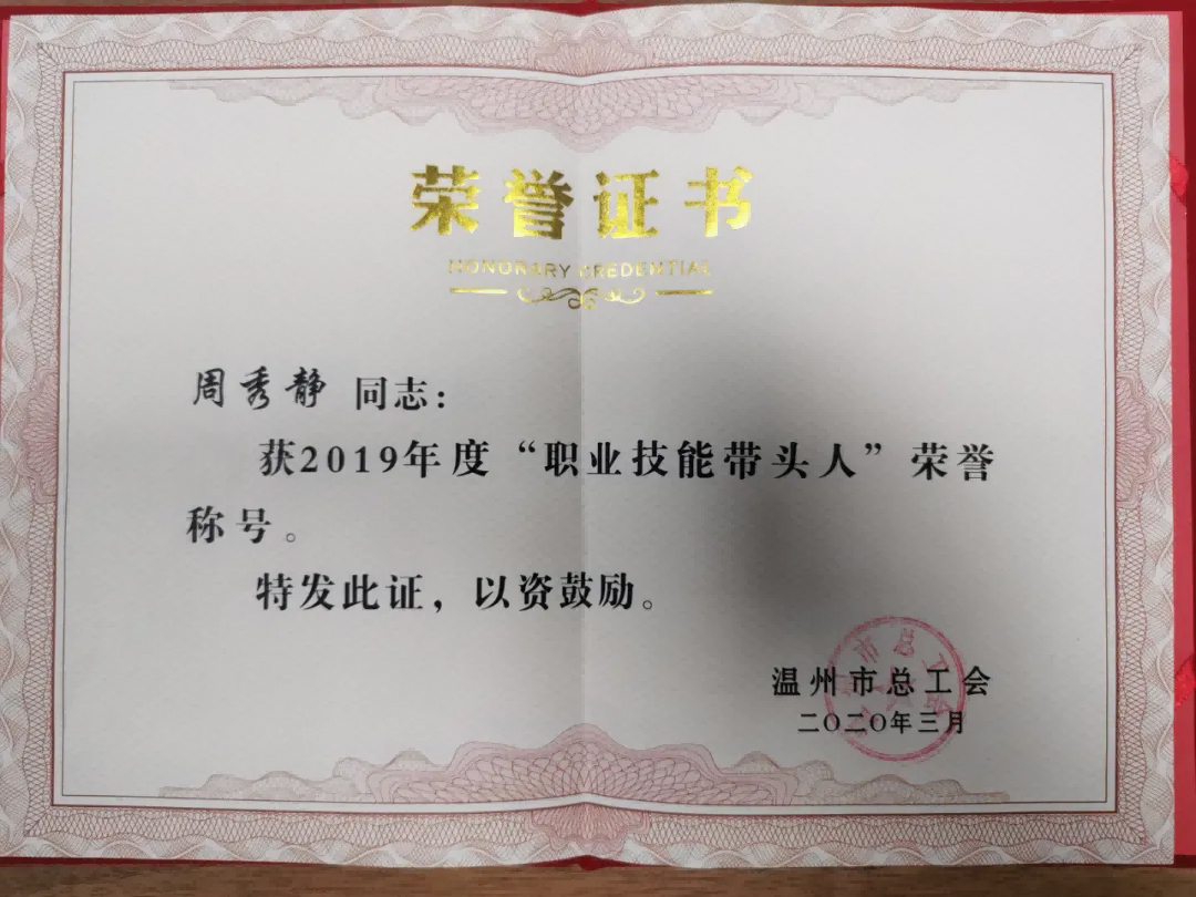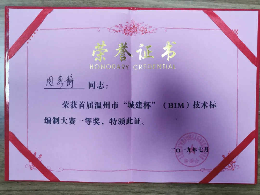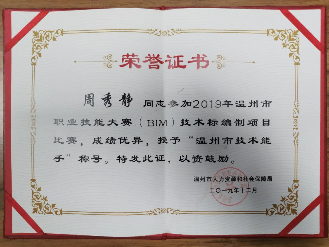 周秀静同志在工作中,态度端正,热爱工作;作风正派,奉献意识浓厚;求真务实,工作成效显著;多次为公司收获荣誉奖章。与此同时,个人也收获了由温州市总工会颁发的“职业技能带头人”称号,由人社局颁发的“温州市技术能手”称号等;并在浙江省建筑装饰行业BIM建模工程师职业技能竞赛和温州市“城建杯”技术标编制大赛中都收获了一等奖。