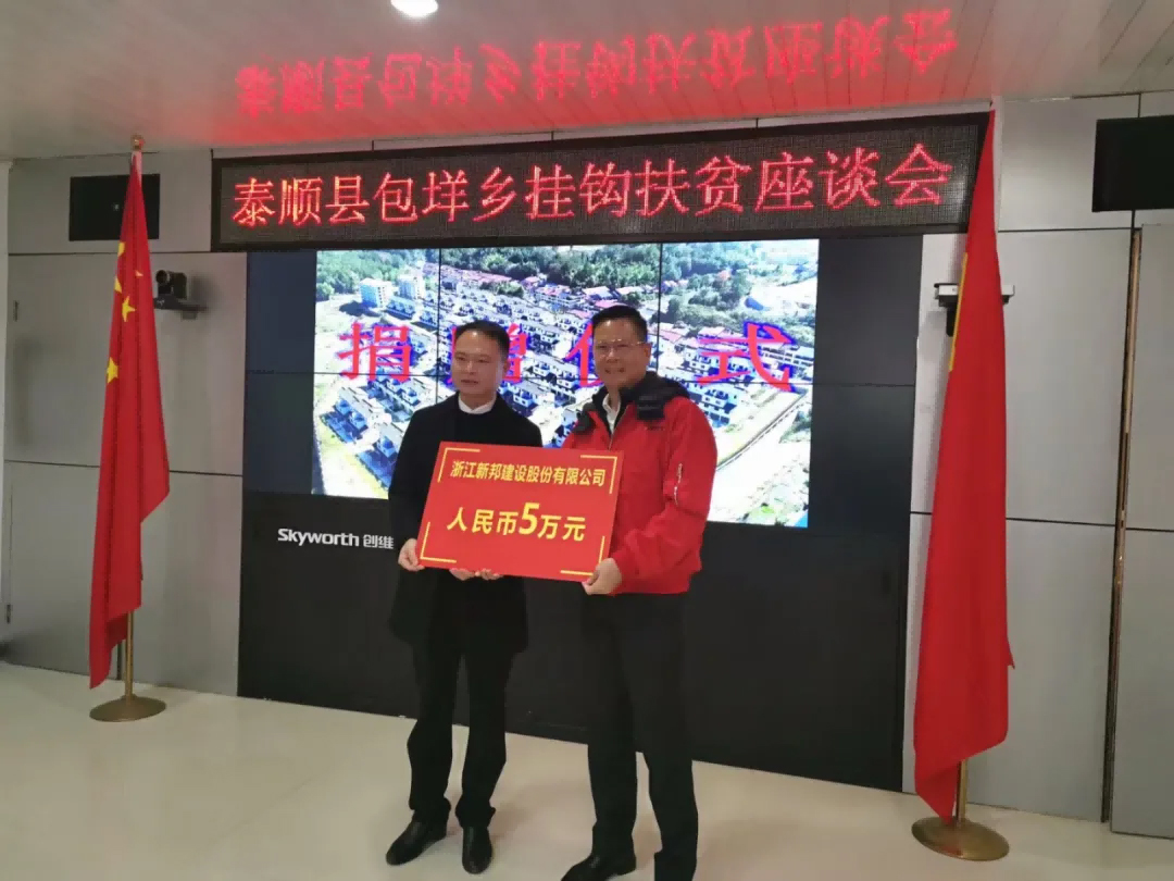 12月2日,新邦建设党总支书记、工会主席李龙跃同志,跟随市人大仇杨均副主任赴泰顺县包垟乡参加挂钩扶贫座谈会,代表新邦建设第四次送上扶贫帮困资金,帮助“包垟乡供水水源一期工程”如期完成,为共建小康尽一份力量。