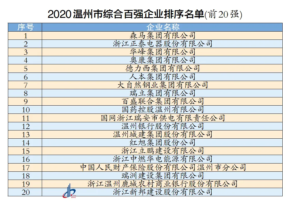 近日,温州市企业联合会、温州市企业家协会、温州市工业经济联合会联合发布2020温州市百强企业榜单。浙江新邦建设股份有限公司荣获温州市百强企业第20名,这是新邦建设连续多年荣获温州百强的殊荣。未来新邦建设势必再接再厉,为温州城市建设贡献自己的力量。