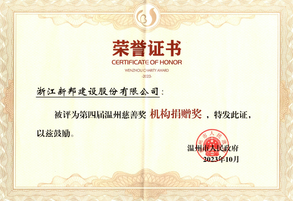 第四届温州慈善大会于12月19日上午召开,市委书记张振丰作重要讲话。本次“温州慈善奖”设置8项奖项,共计200个名额。新邦集团旗下浙江新邦建设股份有限公司荣获“第四届温州慈善奖·机构捐赠奖”。