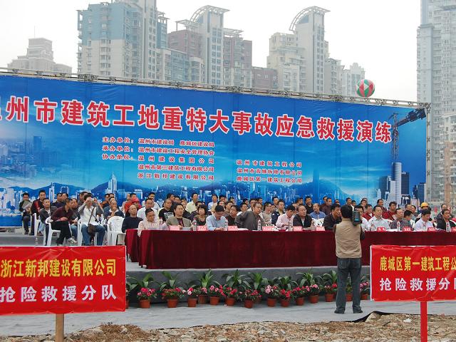 11月1日,在《中华人民共和国突发事件应对法》实施一周年之际,为了加大宣传力度,进一步提高我市建筑工地安全事故应急反映和处置能力,检验《温州市建筑工地重特大质量安全事故应急救援预案》的可行性和有效性,温州市建设局和鹿城区建设局联合组织了建筑工地安全事故应急救援演练。