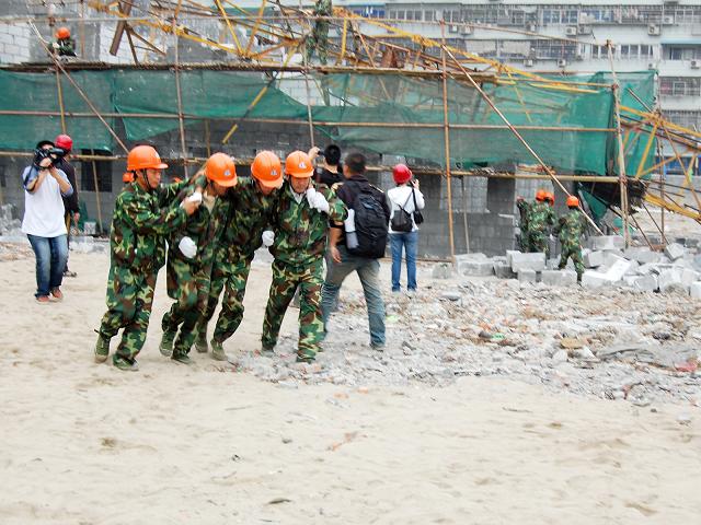 演练模拟在建筑工地发生物料提升机井字架倒塌,压垮正在施工的建筑物并造成人员被困、被压的情况下,组织应急救援。救援首先由工地承建单位的应急救援分队展开自救,随后,市区两级建设行政主管部门启动应急救援预案,组织包括我公司应急救援分队在内的应急救援分队赶赴现场救援。经35分钟紧张救援后,被困人员全部成功脱险,演练取得了圆满的成功。