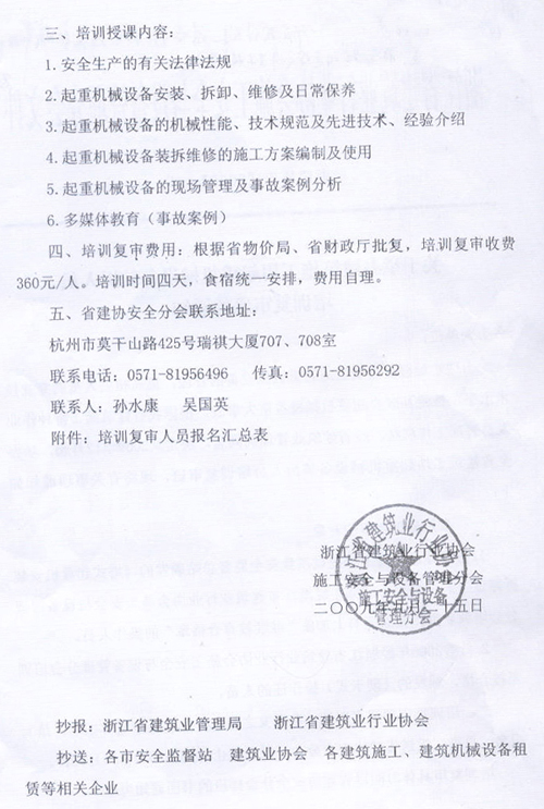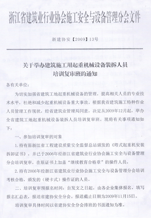 关于举办建筑施工用起重机械设备装拆人员培训复审班的通知