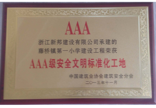 2013年11月5日,中国建筑业协会建筑安全分会下达[2013]10号文件,该文件对全国共计506项被评价为2013年“AAA级安全文明标准化工地”的工地及企业进行了通告,浙江新邦建设因其承建藤桥镇第一小学建设工程项目再次荣获这一殊荣。