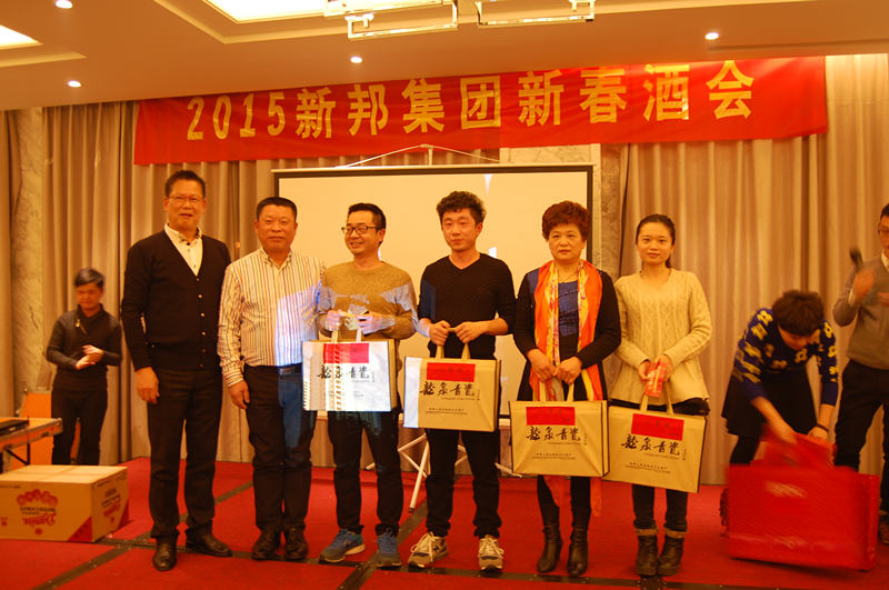 玉羊来到祝福送,紫气东升羊开泰。不知不觉,我们已步入2015年,2月6日晚,新邦集团公司年终酒会在兰立方大酒店隆重举行。大家欢聚一堂,现场气氛热情洋溢。公司为这次酒会精心准备了丰富多样的各式奖项,并给“新邦杯”职工摄影比赛获奖者颁奖。 总经理陈建新在酒会期间致辞总结了过去一年的工作,部署、展望了新一年工作和未来发展。刚刚过去的2014年,对我们公司来说,是具有意义的一年,也是喜获丰收的一年!我们公司整个2014年取得骄人业绩,产值达到30多亿,公司面对外部经济下行、市场需求依然不旺的情况,积极应对,加快转型升级的步伐,并且即将成功上市。对于2015年的目标,公司高层信心满满。全体员工也表示会以更加饱满的热情,更加务实的作风,创新进取,共同创造新的辉煌!
